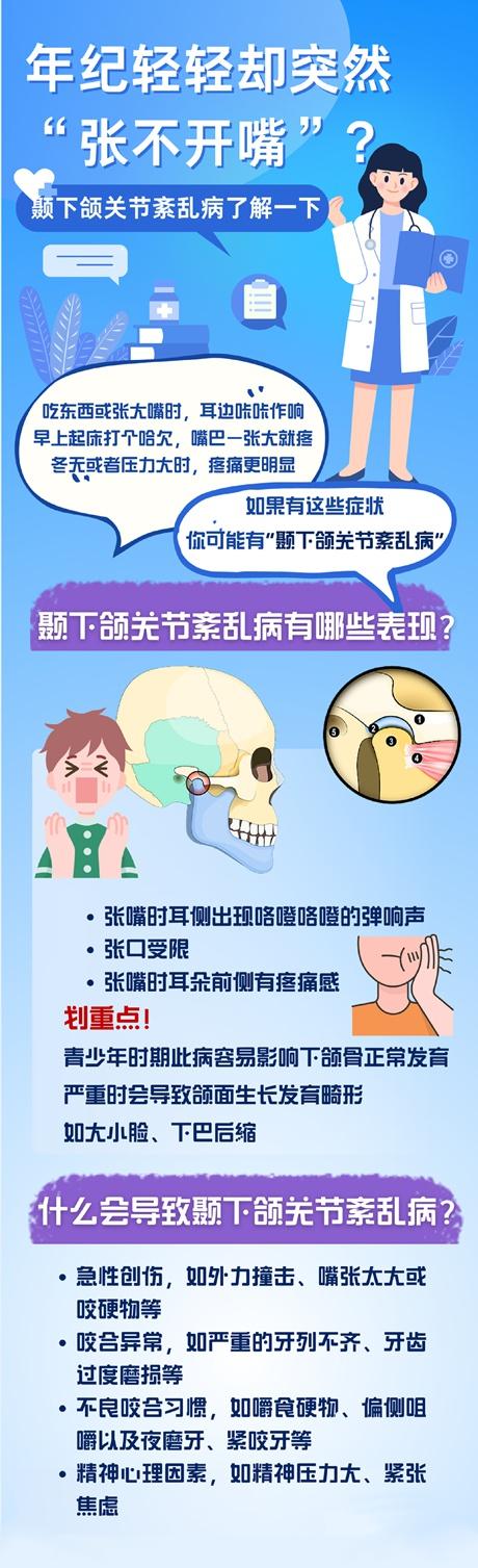 “颞下颌关节紊乱病在临床上有三大表现:张嘴时耳侧出现“咯噔咯噔”的弹响声,张口受限,张嘴时耳朵前侧有疼痛感。”浙江大学医学院附属口腔医院口腔颌面外科主任李志勇是中华口腔医学会第七届颞下颌关节病及学专委会副主委。他告诉中青报·中青网记者,颞下颌关节位于双侧耳屏前区,大张嘴时一般可以摸到骨头的活动。日常生活中咀嚼、吞咽食物、说话、做表情等都和颞下颌关节有关。这个关节最常发生的问题就是颞下颌关节紊乱病。