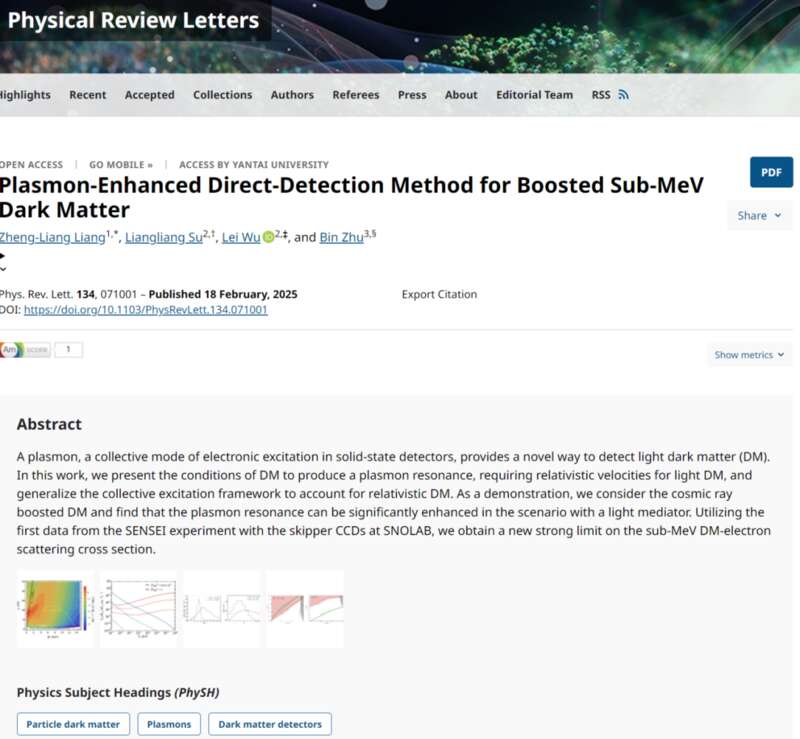 中国青年报客户端讯(郎博涵 中青报·中青网记者 邢婷)近日,烟台大学祝斌教授与北京化工大学梁正良老师、南京师范大学武雷教授、苏亮亮博士在暗物质直接探测领域取得了重要研究突破,显著提升了轻暗物质的探测灵敏度。该研究成果以“Probing Sub-GeV Dark Matter via Plasmon Excitations in Semiconductor Detectors”(“通过半导体等离激元探测轻暗物质”)为题,发表于国际物理学顶级期刊《Physical Review Letters》(《物理评论快报》),祝斌教授为共同通讯作者。