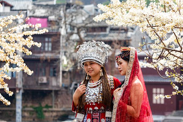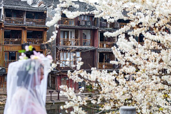 2025年3月2日,湖南湘西州,凤凰古城沱江河畔,游客在赏花游玩。