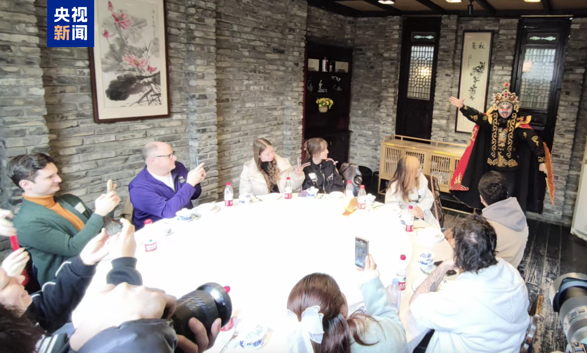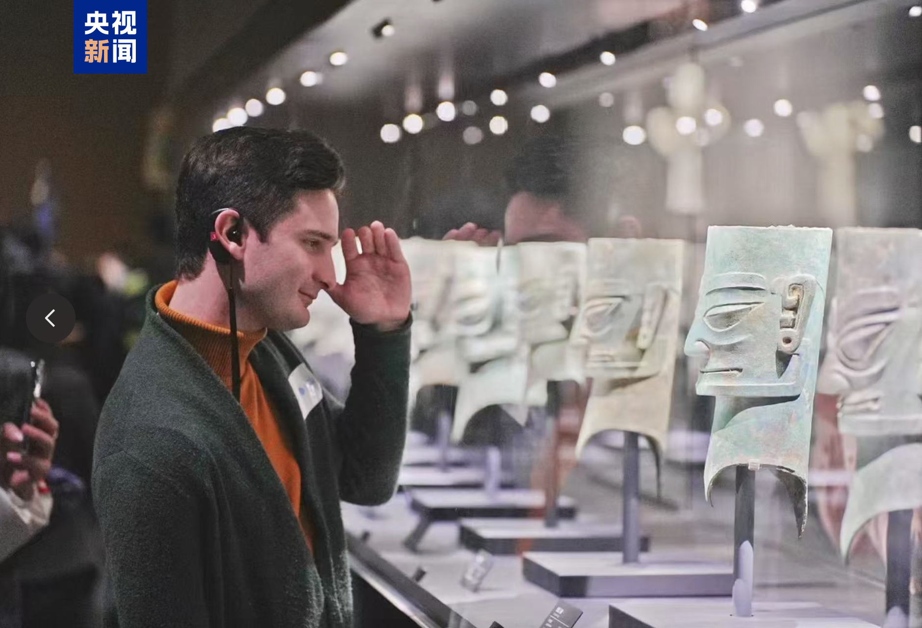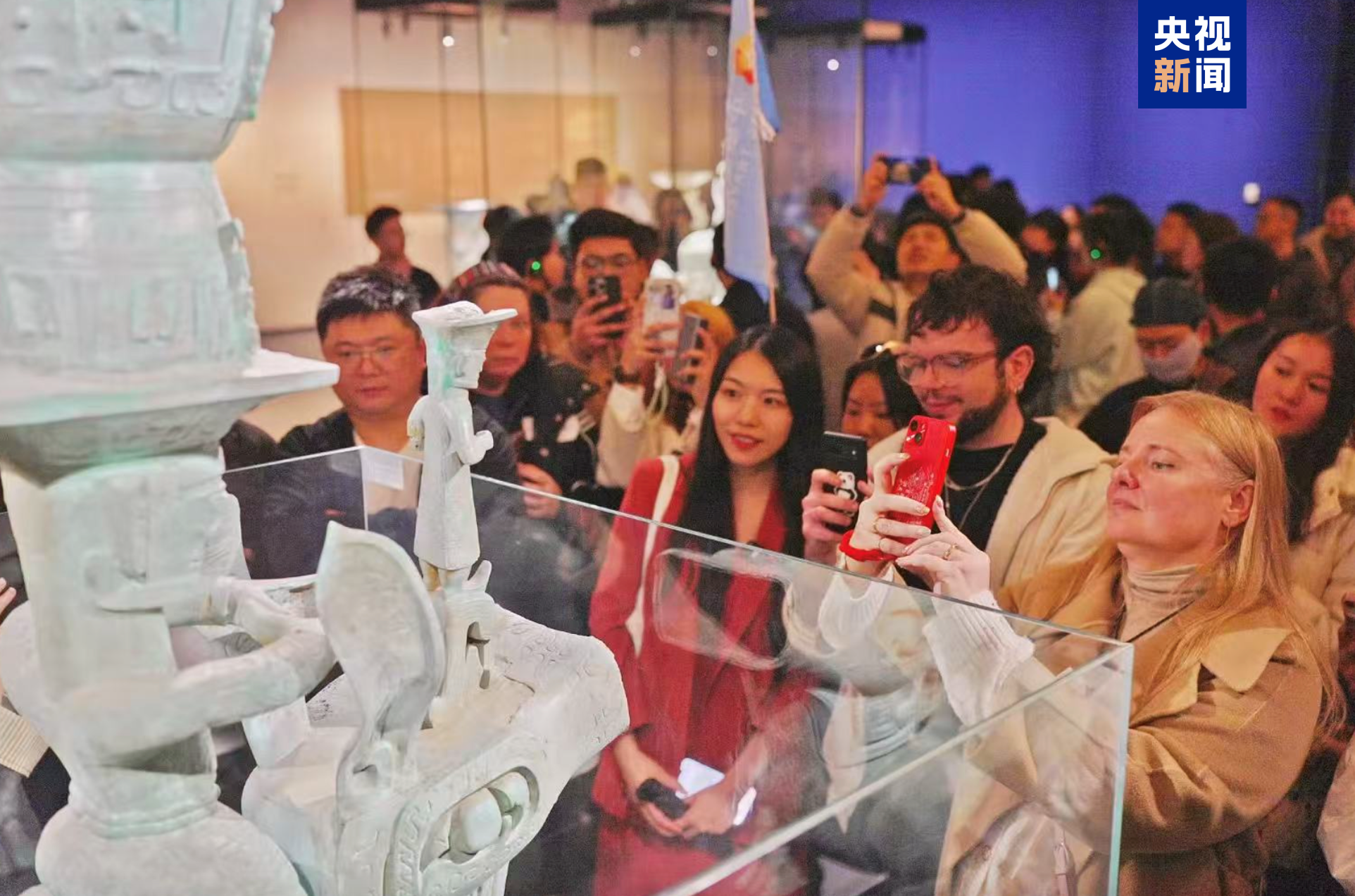 外国游客们体验中国茶艺、观看中国非物质文化遗产代表性项目川剧变脸、参观游览三星堆博物馆,沉浸式感受中国传统文化的深厚底蕴。在三星堆博物馆,电影《哪吒2》里结界兽的原型青铜人像吸引了游客们驻足观看、拍照打卡。