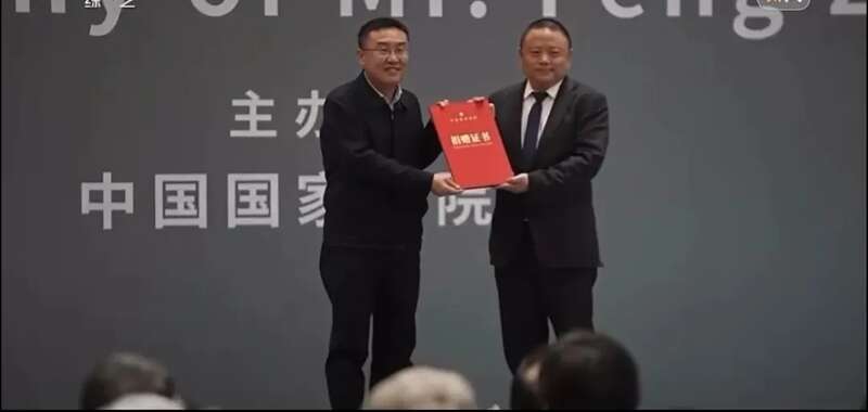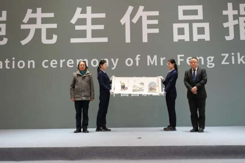 中国国家画院院长刘万鸣,中国国家画院原副院长张江舟,中国美术家协会副主席贾广健,分别代表中国国家画院,接受丰子恺嫡孙、丰子恺研究会会长丰羽捐赠的丰子恺国画作品、生前用砚以及《丰氏家族合作长卷》。