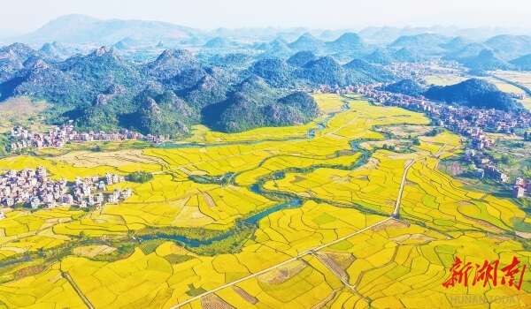 2024年10月10日,湖南省新田县石羊镇南国武当山下,广袤的稻田一片金黄,与河流、村庄、公路等交相辉映,蔚为壮观。 刘贵雄 雷湘婷 摄影报道(湖南图片库)