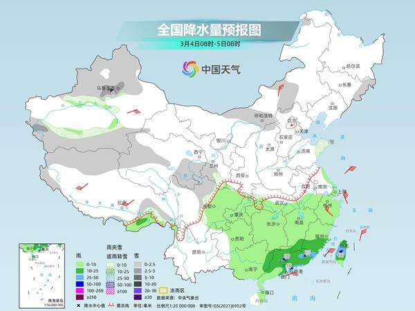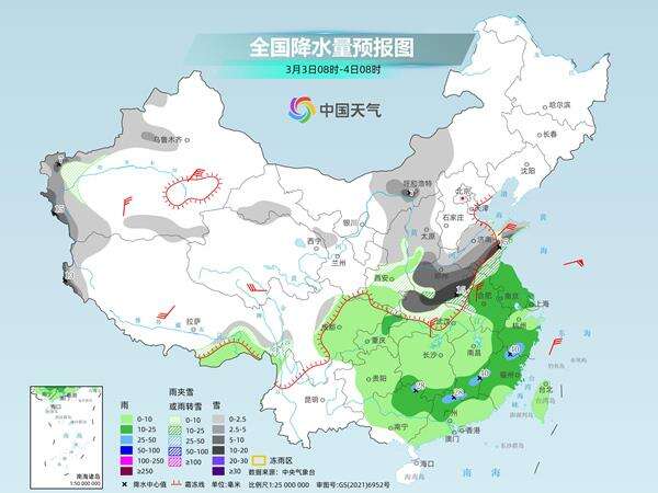 今天(3月3日),我国中东部大范围雨雪持续,部分地区有大到暴雪,明后天,我国降水总体有所减弱,但降水范围仍然较大,需注意防范雨雪天气对交通出行等方面的不利影响。在寒潮和降水影响下,今天江南等地将现“跨季式”降温,多地气温降幅可达20℃左右,体感由初夏回到冬天,公众请注意添衣保暖。