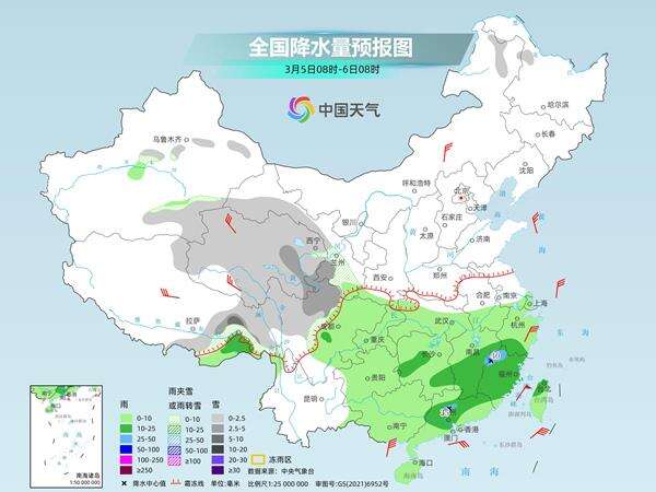 后天,西藏东部、西北地区中部、川西高原北部等地部分地区有小雪或雨夹雪,其中,西藏东部、青海东南部、甘肃南部、川西高原北部等地部分地区有中到大雪。西藏东南部、江汉大部、江南、西南地区东部、华南、台湾岛等地部分地区有小到中雨,其中,江西东北部、福建西北部、广东北部等地部分地区有大雨。