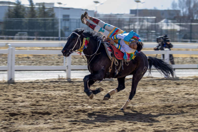 3月2日,马术队员在表演传统马术项目捡哈达。 新华社记者 晋美多吉 摄