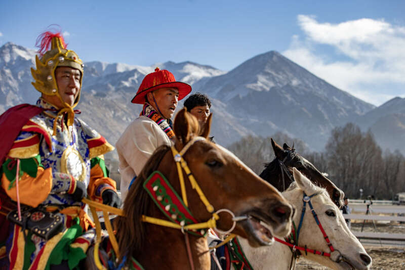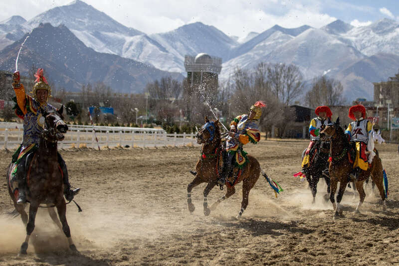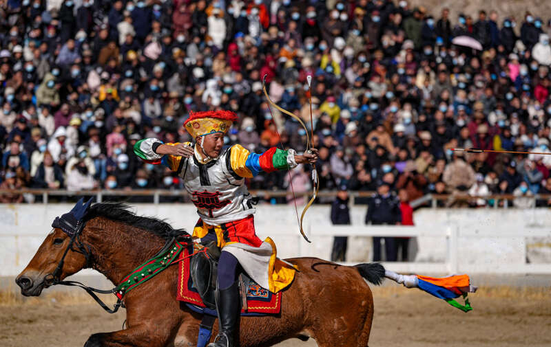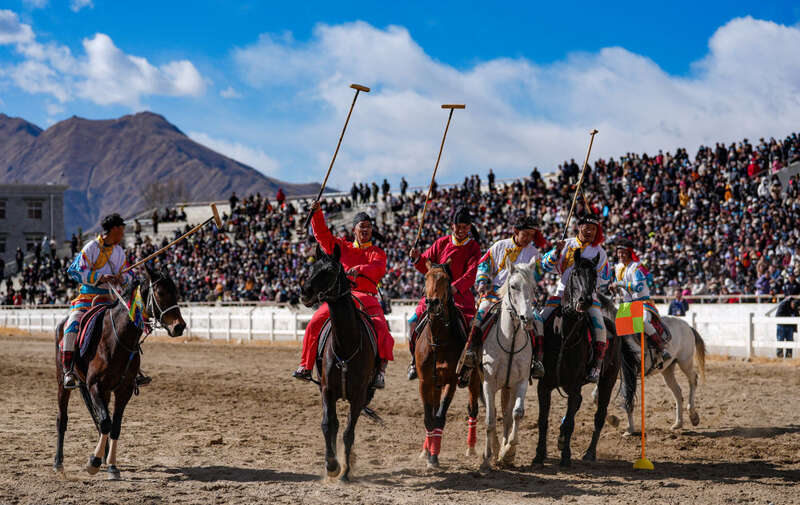 当日,2025年藏历新年初三民族传统马术表演暨民族赛马活动在拉萨市北郊赛马场举行。马术在西藏是吉祥、勇敢和智慧的象征。骑手们用精彩表演为观众送上新年的祝福。