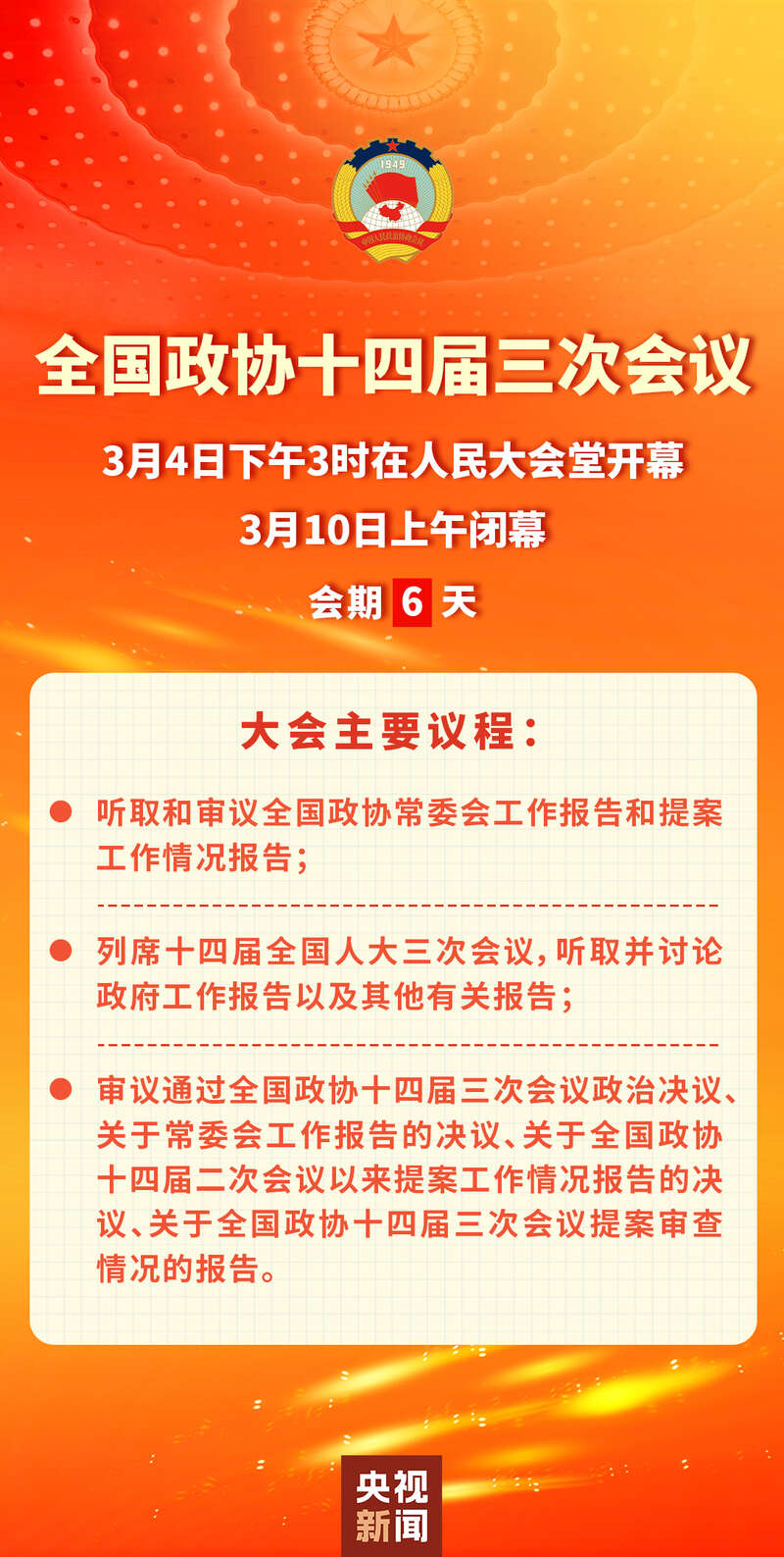 全国政协十四届三次会议将于3月4日下午3时在人民大会堂开幕,3月10日上午闭幕,会期6天。