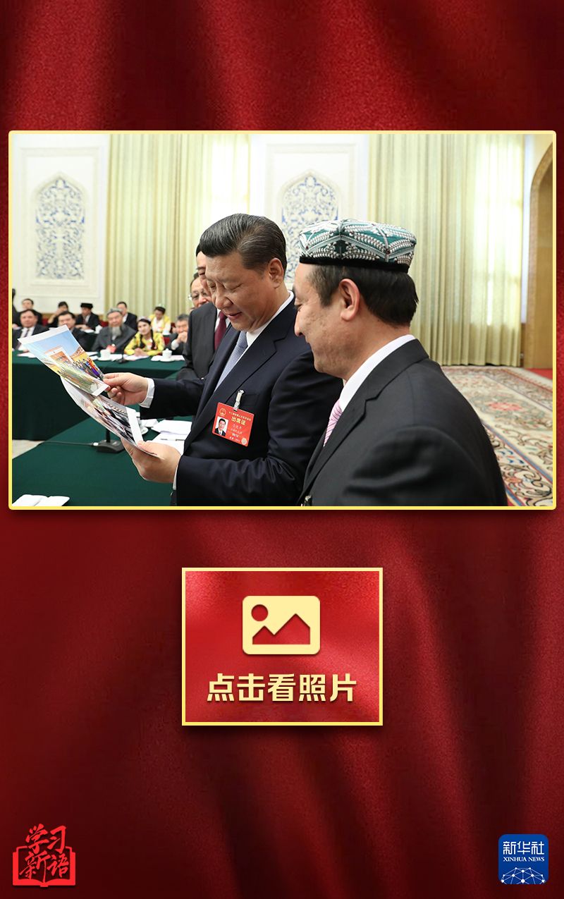 习近平总书记望着一张特殊的“全家福”,对来自和田地区策勒县策勒乡巴什玉吉买村的买买提依布热依木·买买提明代表亲切地说。