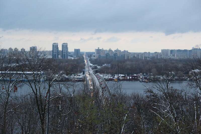 这是2024年11月21日在乌克兰首都基辅拍摄的白雪映衬下的地铁桥和第聂伯河。(新华社记者李东旭摄)