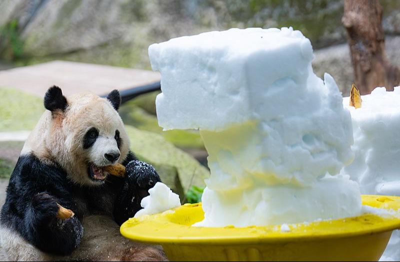 重庆动物园大熊猫玩雪爬树享用“冰糕大餐”
