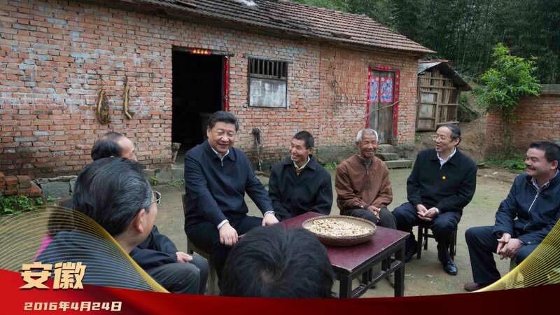 2016年4月24日,习近平沿着山路乘车1个小时,来到安徽省六安市金寨县花石乡大湾村考察脱贫工作。在农家院里,习近平同乡亲们围坐在一起拉家常,听取村民对扶贫政策的想法。