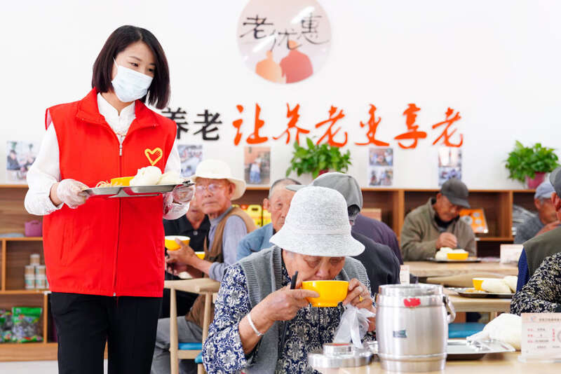 2024年5月10日,志愿者在山东省日照市岚山区一家养老服务中心为就餐老人端饭。