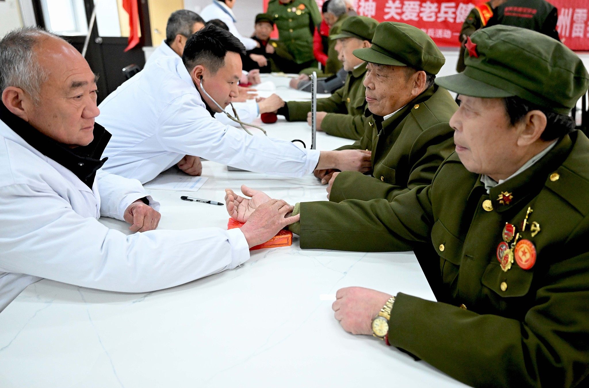 2025年3月5日,安徽亳州,在亳州市谯城区光荣院,志愿者为退役老军人进行爱心义诊。当天是学雷锋纪念日,亳州市退役军人事务局、亳州市拥军协会等单位联合开展志愿服务活动,组织20多名志愿者为生活在这里的退役老军人提供帮助,以实际行动践行雷锋精神。
