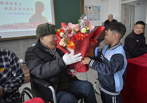2025年3月5日,辽宁沈阳,在沈阳市第七中学卓越小学,一位小朋友给雷锋生前战友乔安山献花。