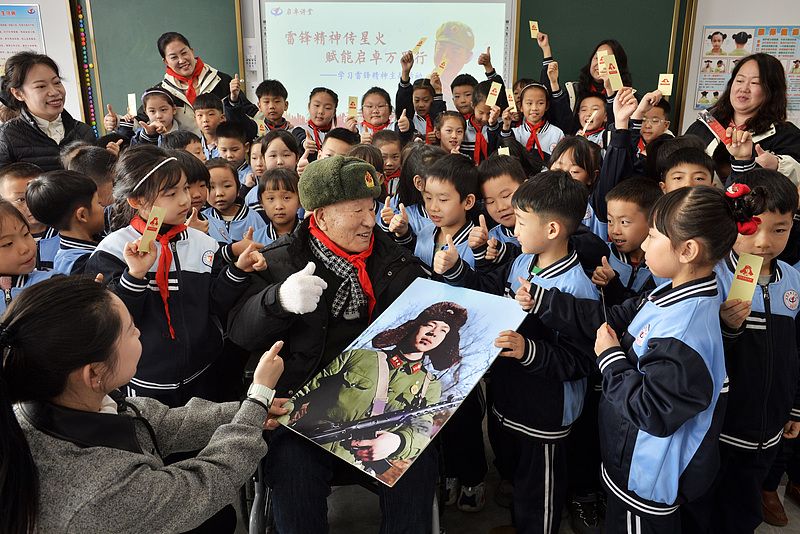 2025年3月5日,沈阳市第七中学卓越小学的师生们聆听雷锋生前战友乔安山介绍雷锋的事迹。