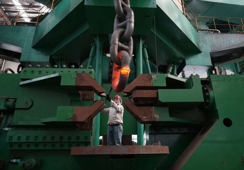 2024年6月4日,江苏泰州靖江市江苏亚星锚链股份有限公司工人在生产车间作业。该公司前身是40多年前创办于靖江东兴镇的一个小厂,经过多年发展,逐渐成长为国家级制造业单项冠军示范企业。目前该公司船用链条全国市占率达70%,全球市占率超50%,业务已拓展到海洋钻井平台、海洋生产平台、海上风电设施的系泊锚链等领域。
