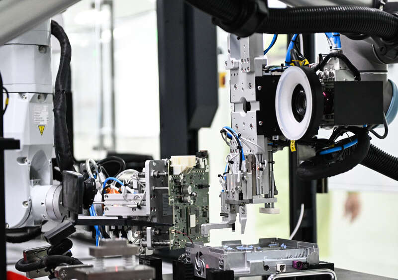2024年2月27日,在江苏无锡车联天下信息技术有限公司,机器人在生产智能网联汽车座舱域控制器。近年来,无锡市全力提升产业创新能力和数字化绿色化发展水平,一批企业通过生产换线、人机协同、“上云用数赋智”等,打造智能工厂、智能车间,推动企业降本、提质、节能、增效,为制造业高质量发展提供新动能。