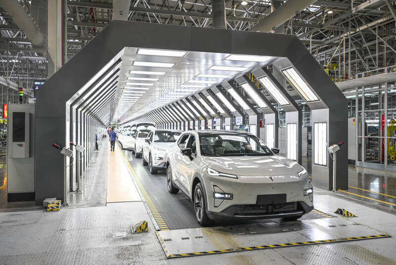 2025年1月9日在位于重庆市渝北区的长安汽车数智工厂总装车间拍摄的即将下线的新能源汽车。2024年,中国新能源汽车年产量首次突破1000万辆,出口量首次突破200万辆。