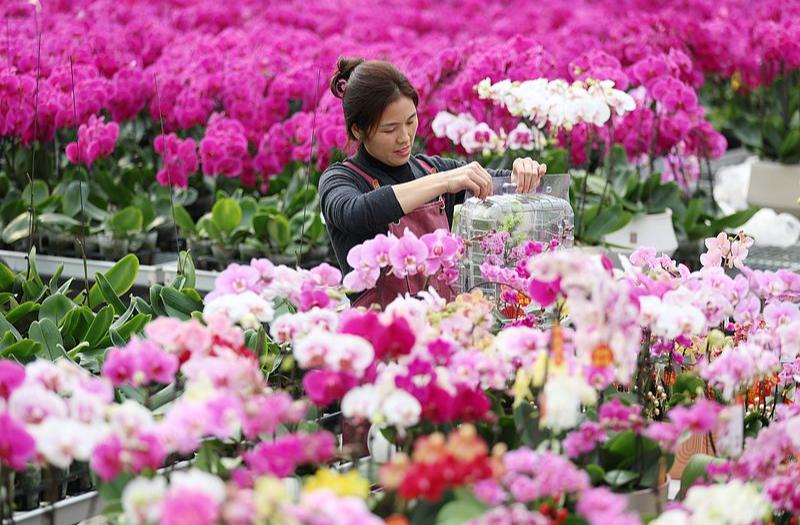 山东临沂:工人整理蝴蝶兰 供应“三八节”市场