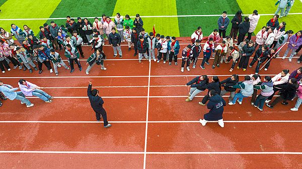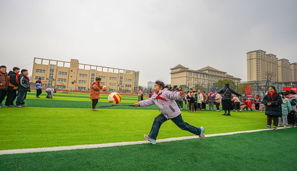 2025年3月5日,江苏省宿迁市泗洪县洪桥学校举行趣味运动会,活动设置了拔河、蚂蚁运球、持杆跑等9个团体比赛项目,鼓励每个孩子参与,展现活力。