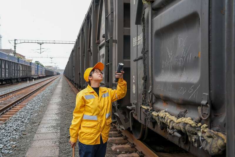 目前正值春耕备耕的关键时期,化肥等春耕物资正持续通过防城港进口或北上转运全国各地。欧丽苑所在班组每班次的始发作业量平均约26趟,一个班列车检查下来,她需行走3万多步,蹲下起立2000余次。检车时,伴随着“叮叮当当”的检点锤敲击声,欧丽苑仔细检查着每一节货车,在货场里奏响了特殊的“安全交响曲”。