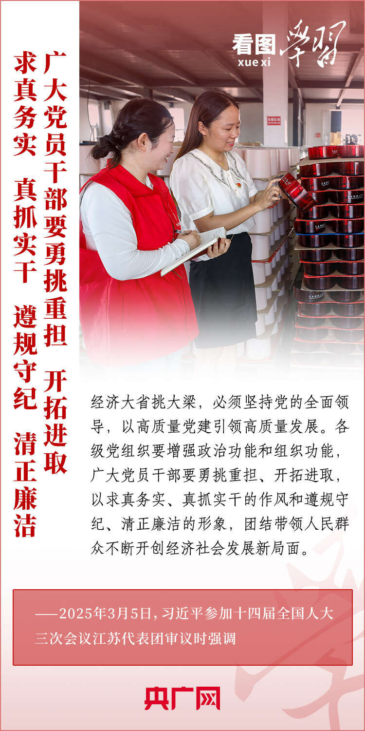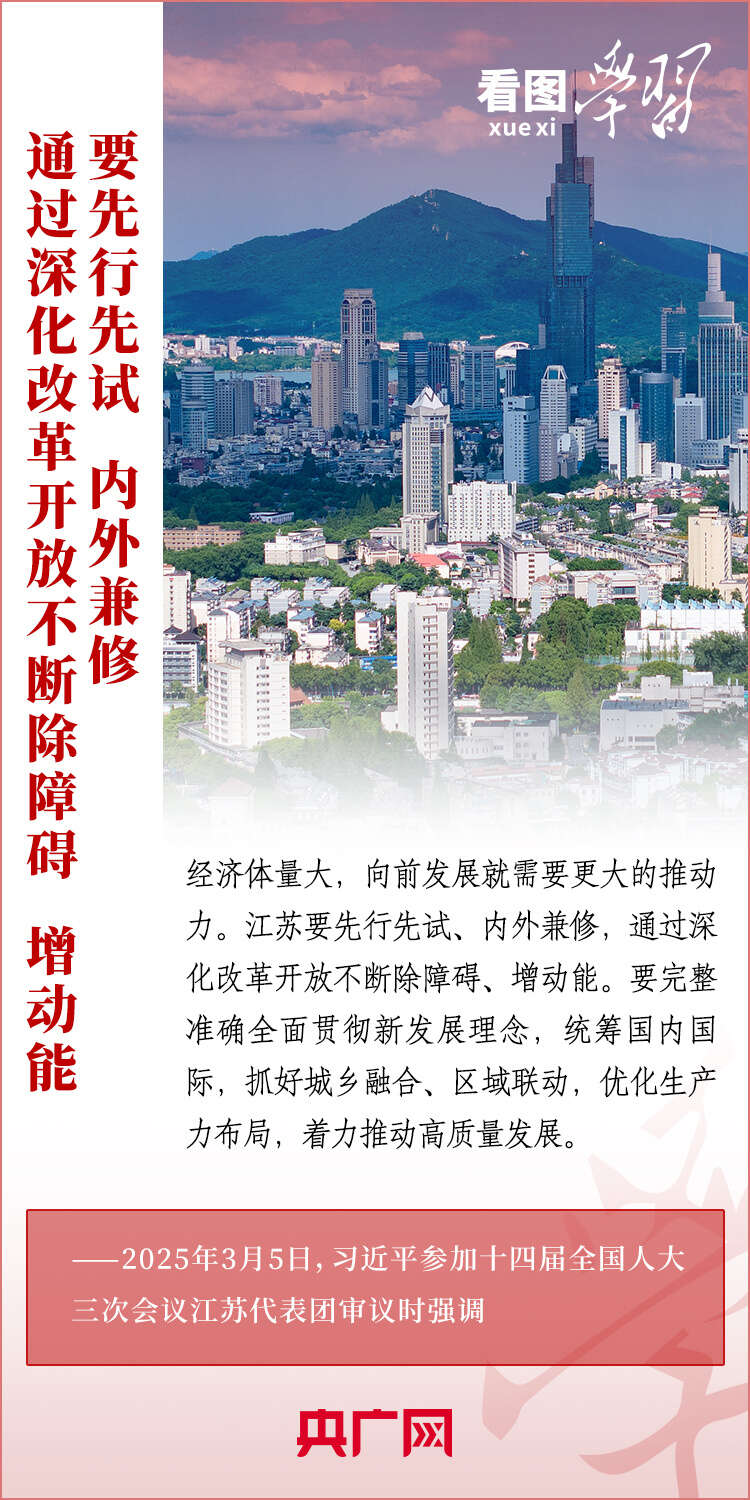 “经济大省在落实国家重大发展战略上应有更大的担当。”3月5日,习近平总书记参加他所在的十四届全国人大三次会议江苏代表团审议时发表重要讲话,对江苏工作予以肯定,强调“经济大省要挑大梁”,在推动科技创新和产业创新融合上打头阵,在推进深层次改革和高水平开放上勇争先,在落实国家重大发展战略上走在前,在促进全体人民共同富裕上作示范。一起来学习!