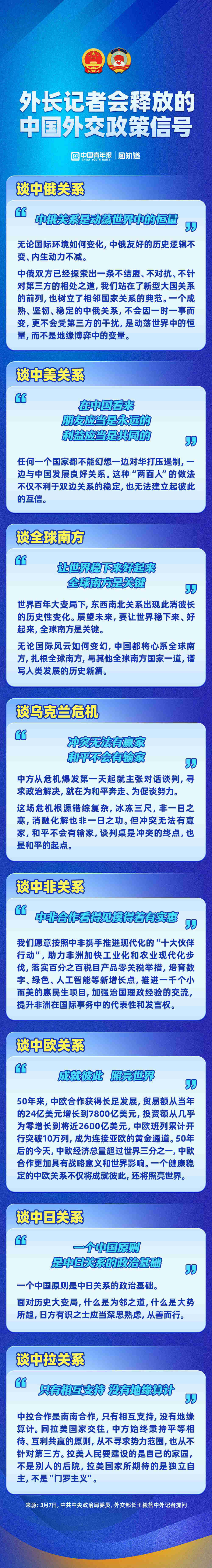 3月7日上午,中共中央政治局委员、外交部长王毅就“中国外交政策和对外关系”相关问题回答中外记者提问。近90分钟的时间里,外长回应了中国外交、中俄关系、中美关系、中欧关系、乌克兰危机等热点问题,密集释放中国外交政策信号。