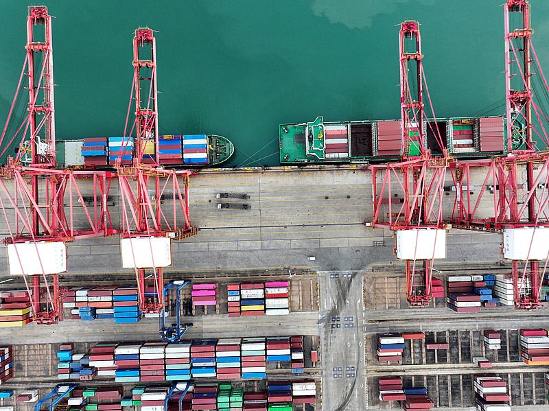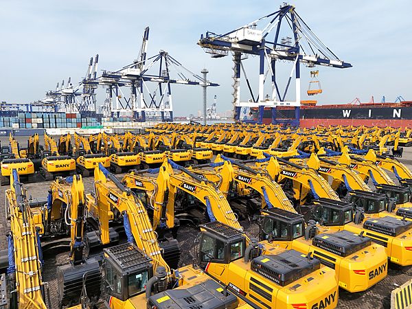 2025年3月7日,山东港口烟台港,出口非洲的国产工程机械装入中非班轮。