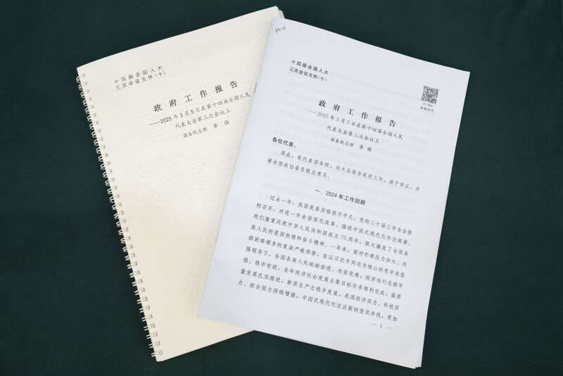 这是3月5日在全国政协十四届三次会议社会福利和社会保障界别小组会议现场拍摄的盲文版政府工作报告(左)和普通版政府工作报告。
