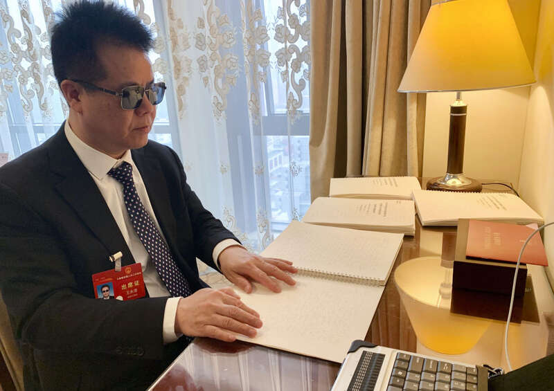 3月5日,政协委员触摸盲文版政府工作报告。