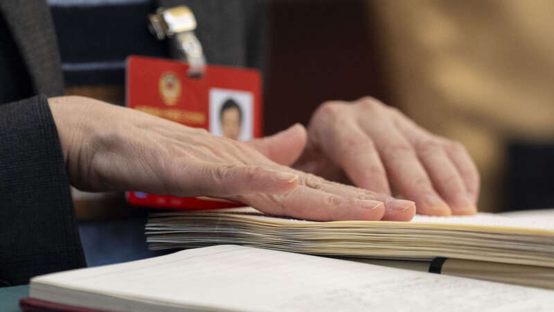 2024年3月5日,在十四届全国人大二次会议开幕会上,王永澄代表(中)用手指阅读盲文版的政府工作报告。