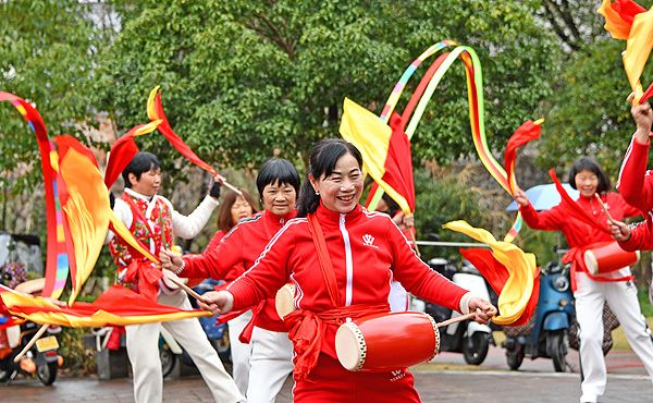 2025年3月6日,浙江省台州市仙居县南峰街道女子腰鼓队正在腰鼓表演,喜迎“三八”妇女节。