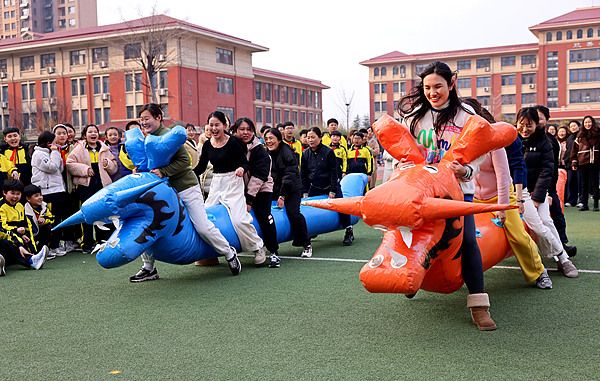 2025年3月6日,山东枣庄市中区东湖小学,女教师们参加“旱地龙舟”趣味比赛。