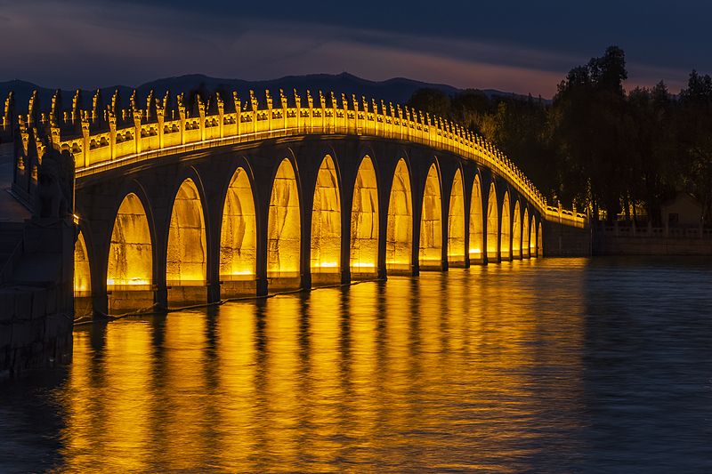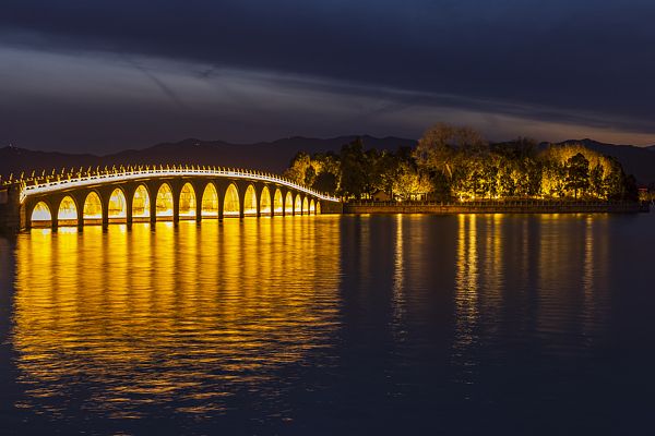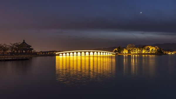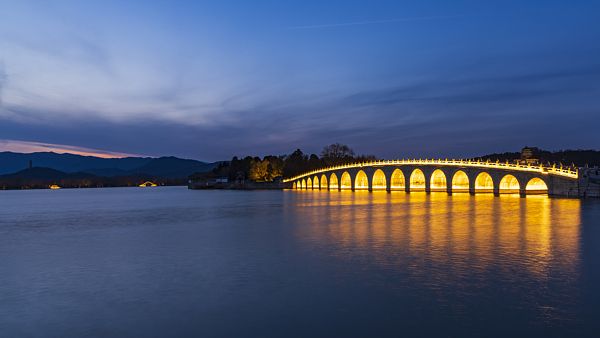 北京颐和园十七孔桥亮灯 呈现夜景版“金光穿洞”