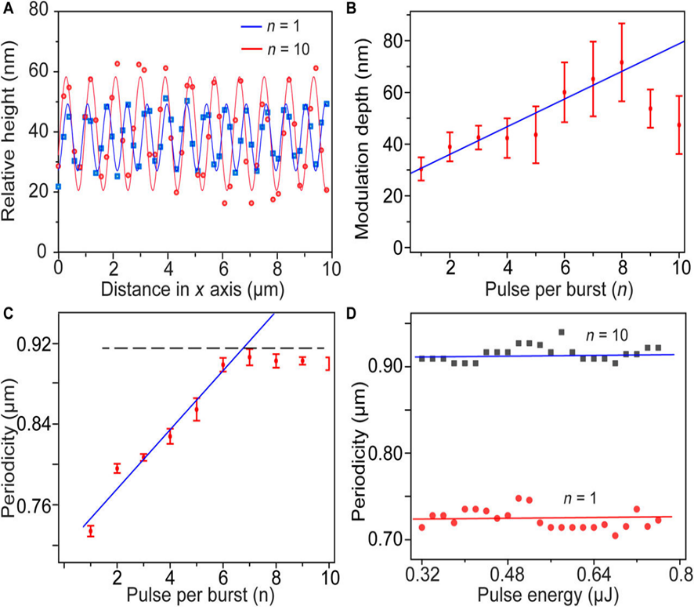 (A)LIPSS沿x方向的相对高度;(B)LIPSS的调制深度;(C)周期与单脉冲串脉冲数的关系;(D)LIPSS的周期与激光脉冲能量的关系