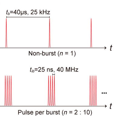 单脉冲加工模式(上)与脉冲串加工模式(下)示意图