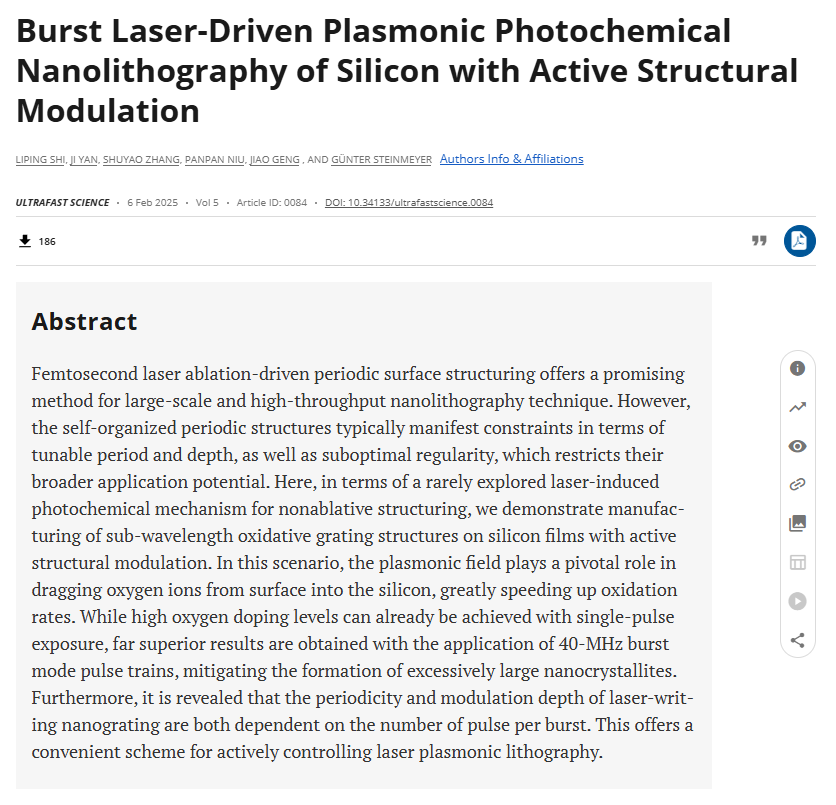 Burst Laser-Driven Plasmonic Photochemical Nanolithography of Silicon with Active Structural Modulation 为题