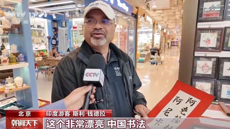 印度游客 斯利·钱德拉:中国电影很流行,我每到一个地方,都会用当地文字写下女儿的名字。我喜欢文化,不同地域的当地文化,这个非常漂亮,中国书法。