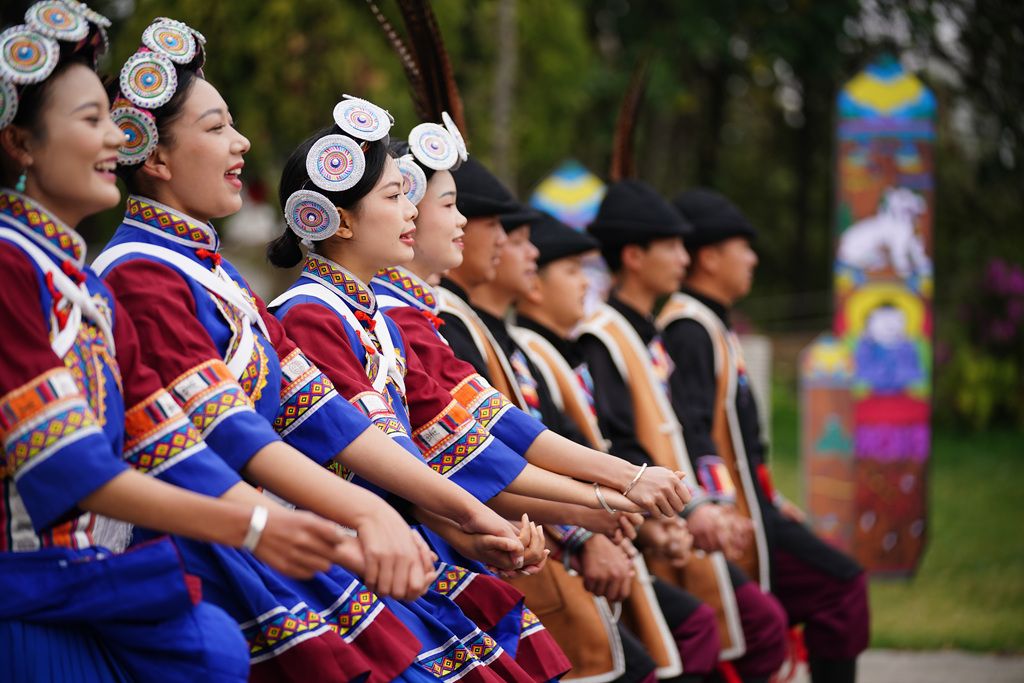 2025年3月8日,昆明,纳西族姑娘小伙为游客献上精彩节目。当日,位于昆明市的云南民族村景区举办纳西族传统“三多节”活动,吸引众多游客参与体验,沉浸式感受纳西族文化魅力。 中新社记者 刘冉阳 摄