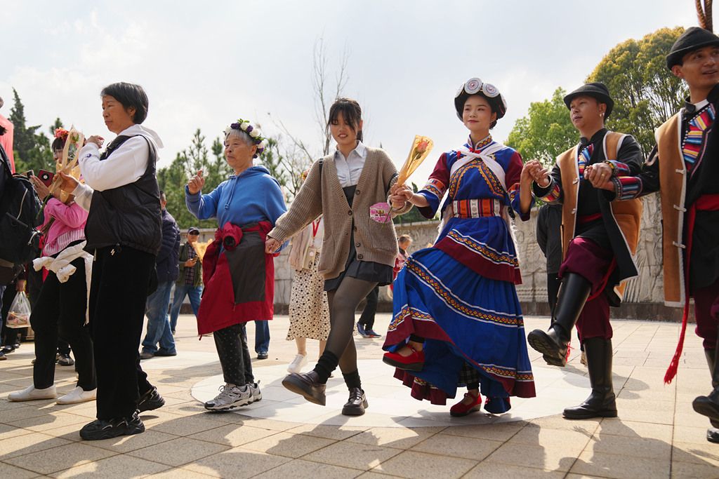 2025年3月8日,昆明,纳西族姑娘小伙带领游客打跳。当日,位于昆明市的云南民族村景区举办纳西族传统“三多节”活动,吸引众多游客参与体验,沉浸式感受纳西族文化魅力。 中新社记者 刘冉阳 摄