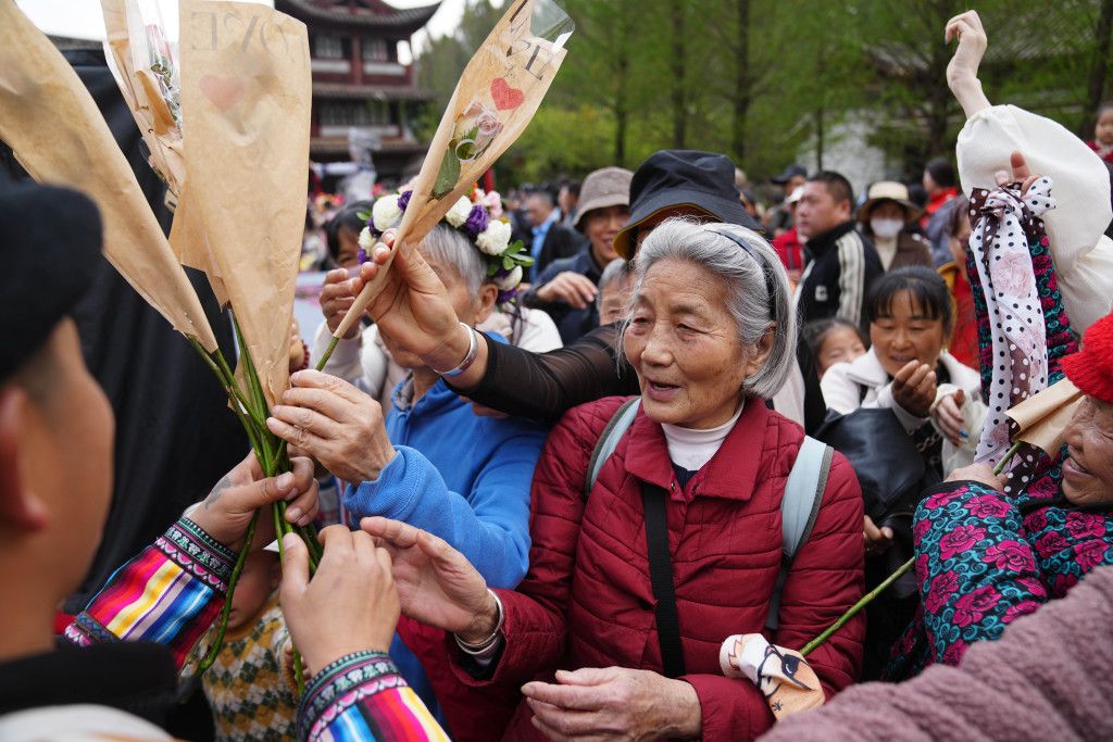 2025年3月8日,昆明,恰逢“三八”国际妇女节,纳西族小伙为女性游客送上祝福。当日,位于昆明市的云南民族村景区举办纳西族传统“三多节”活动,吸引众多游客参与体验,沉浸式感受纳西族文化魅力。 中新社记者 刘冉阳 摄