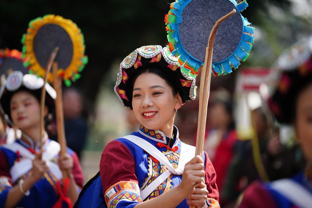 2025年3月8日,昆明,纳西族姑娘为游客献上精彩节目。当日,位于昆明市的云南民族村景区举办纳西族传统“三多节”活动,吸引众多游客参与体验,沉浸式感受纳西族文化魅力。 中新社记者 刘冉阳 摄