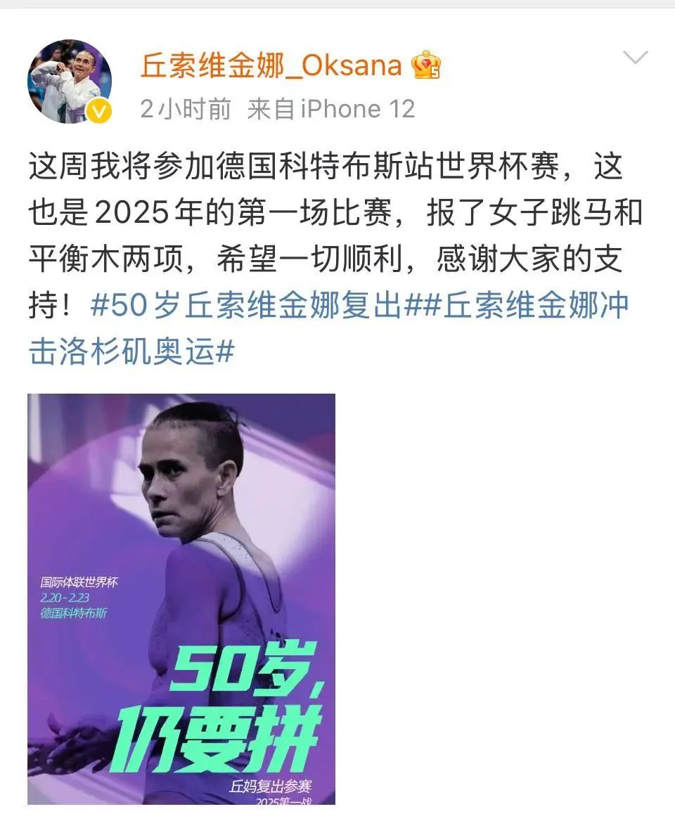 当时,即将在今年6月迎来50岁生日的丘索维金娜写道:“这周我将参加德国科特布斯站世界杯赛,这也是2025年的第一场比赛,报了女子跳马和平衡木两项,希望一切顺利,感谢大家的支持!”