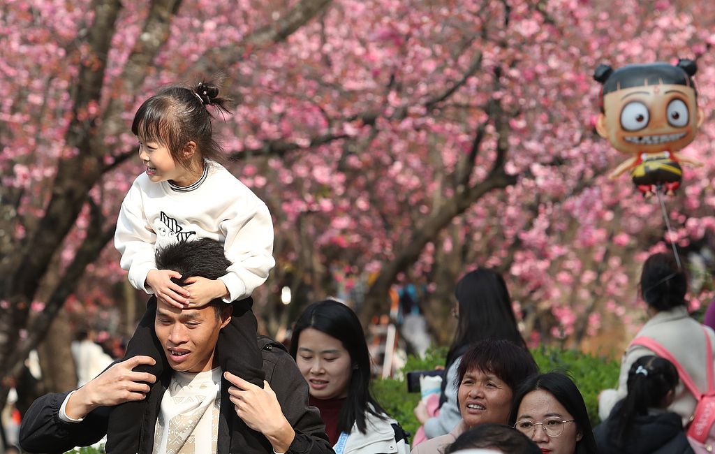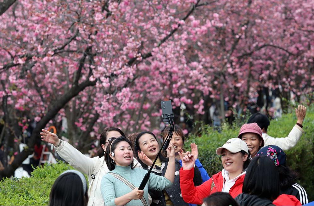 2025年3月8日,云南省昆明市,阳春三月,圆通山樱花、海棠迎来最美赏花季,粉色花海营造春城浪漫春景,吸引市民游人前来赏花游春,处处呈现花海人潮的春日盛景。