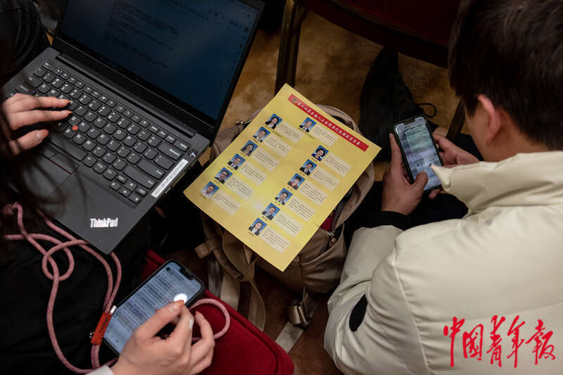 3月9日,北京人民大会堂台湾厅,采访台湾省代表团开放团组会议的记者坐在地上写稿。中青报·中青网记者 李隽辉/摄
