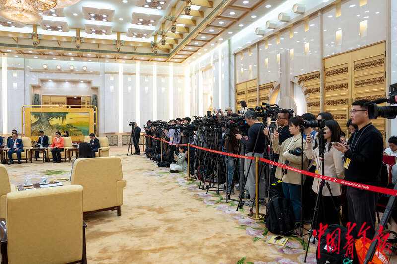 3月9日,北京人民大会堂台湾厅,参加台湾省代表团开放团组会议的记者站满了采访区。中青报·中青网记者 李隽辉/摄