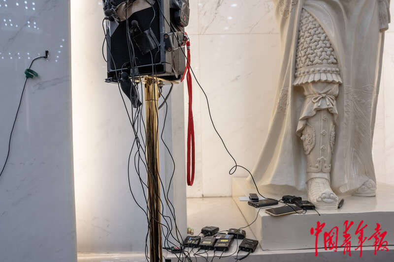 3月9日,北京人民大会堂台湾厅,郑成功雕像旁的音响被记者们贴满了收音装置。中青报·中青网记者 李隽辉/摄