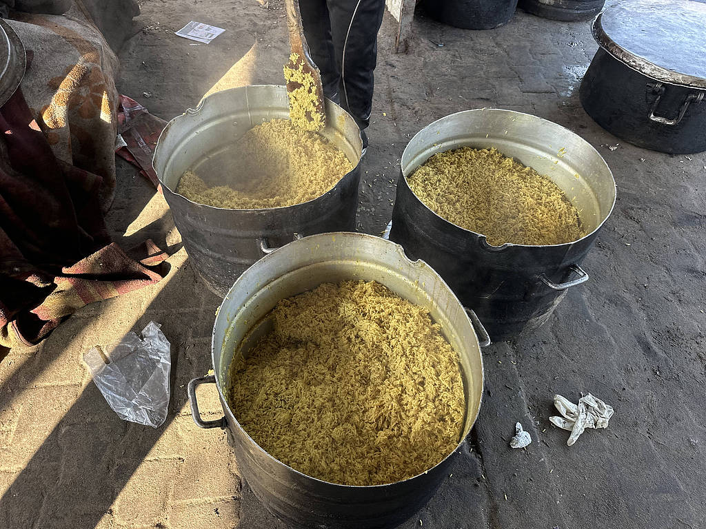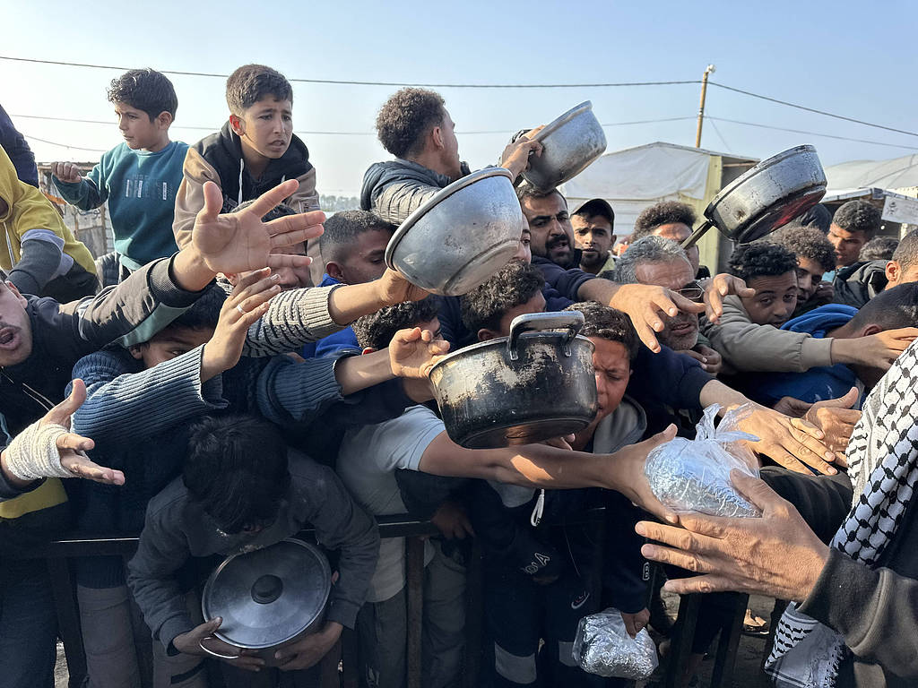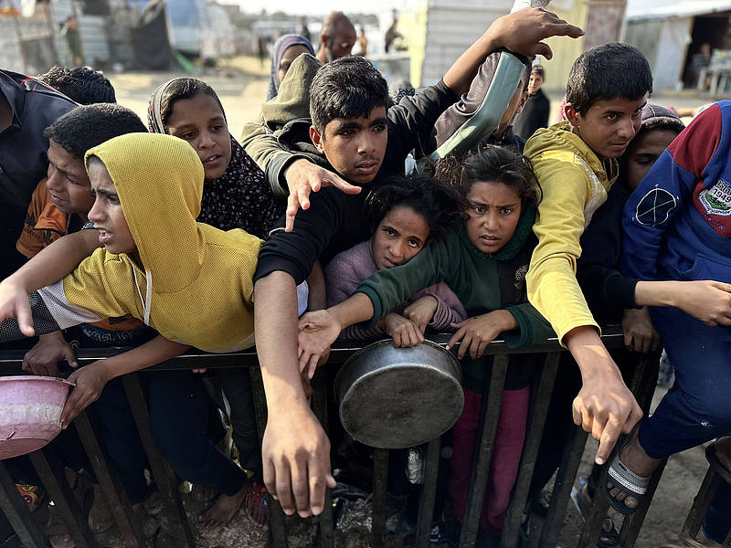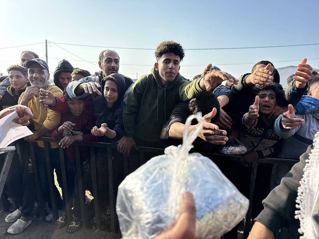 当地时间2025年3月8日,加沙地带汗尤尼斯,巴勒斯坦人排队等待领取热餐,慈善机构在为巴勒斯坦人分发食物,这是伊斯兰圣月斋月的第八天。