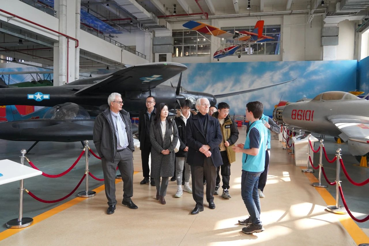 在航空航天博物馆,中法工程师学院的两名学生讲解员叶雨坤和瑞斯安(Tristan)向Mourou教授介绍了博物馆的历史及主要展品。参观过程中,Mourou教授对展品的珍稀性和保存完整度表达了高度赞赏,同时也对北航在培养航空航天人才和推动科技进步方面作出的卓越贡献给予了高度评价。