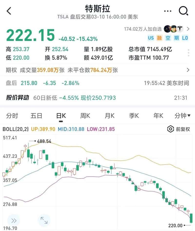 当地时间3月10日,特斯拉股价收盘跌超15%